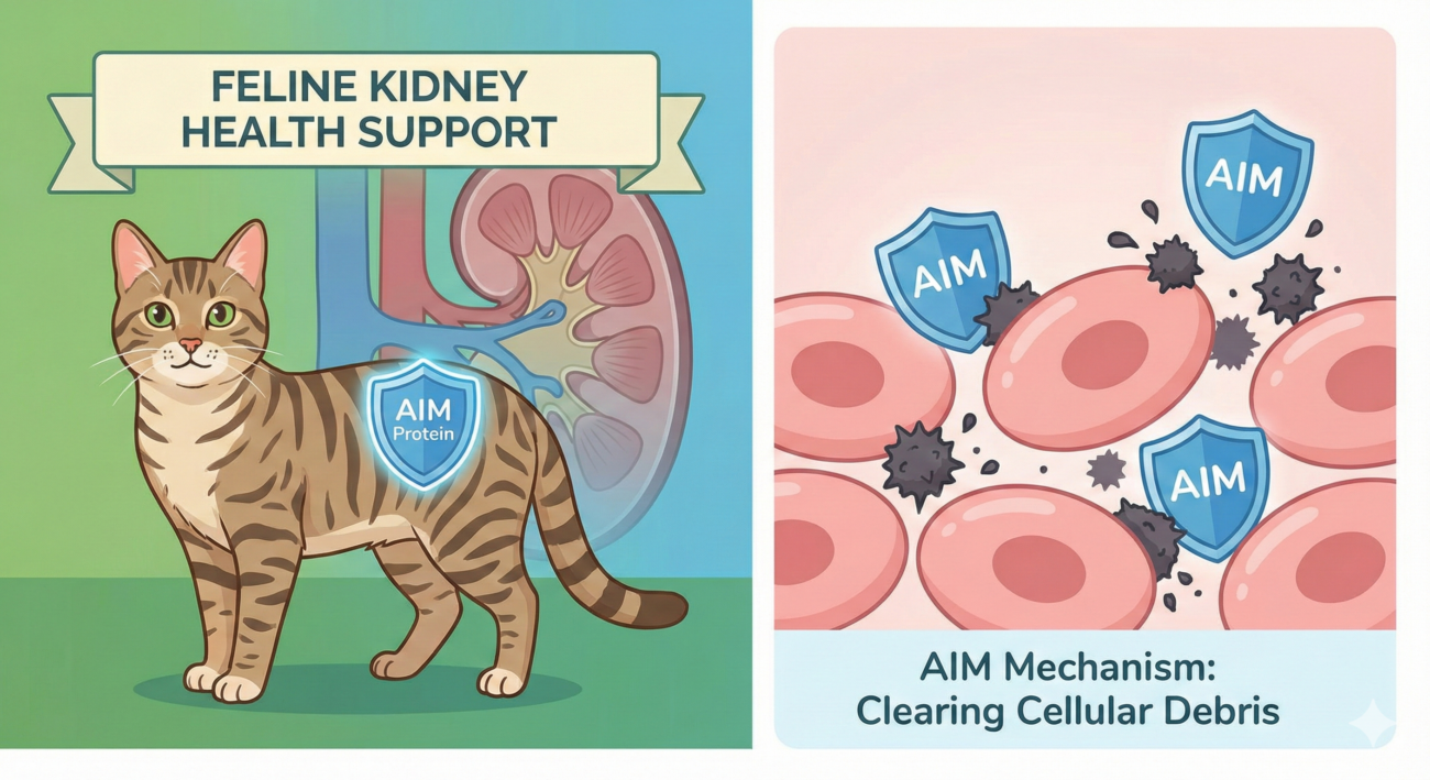 - In cats: Due to a unique genetic trait, the cat’s AIM is “lazy.” It remains too closely bound to antibodies (IgM) in the blood and does not activate when needed.
